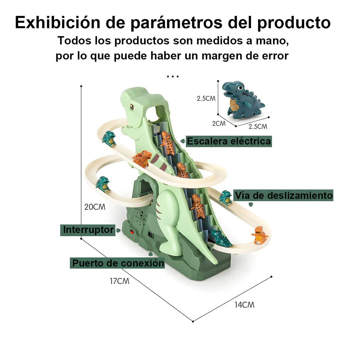 • 🧗♂️ Escaleras de escalada + pista eléctrica, ¡los dinos suben y bajan sin parar!